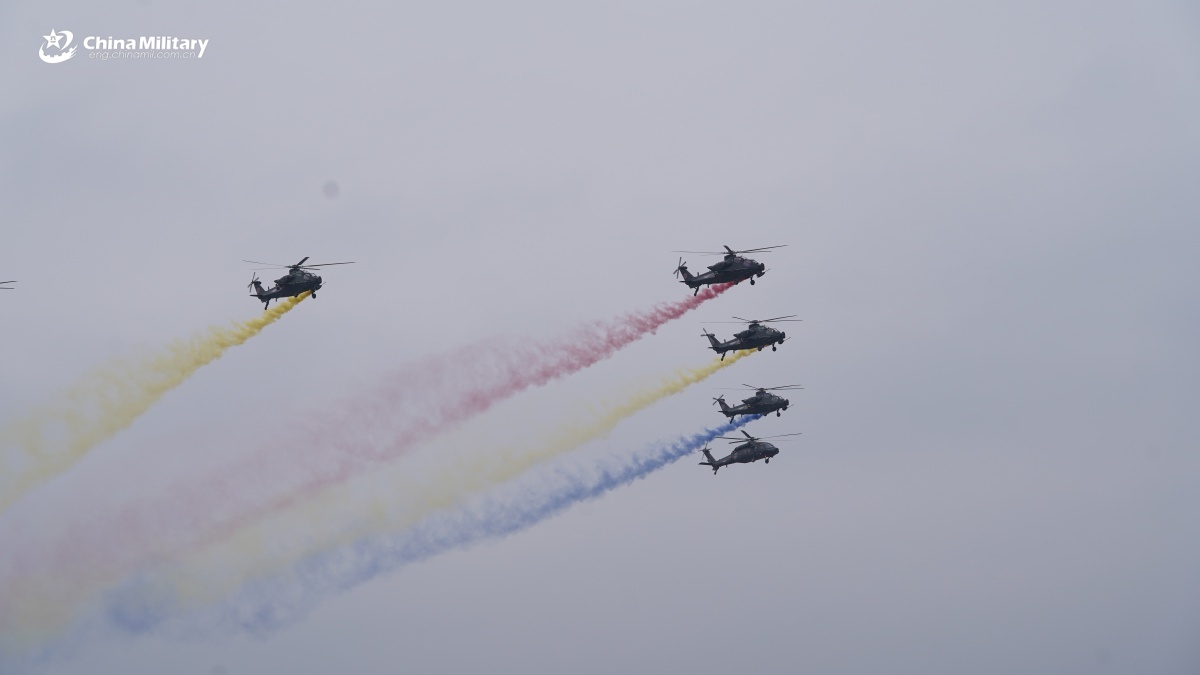Z-10 attack helicopters and Z-20 utility helicopters attached to the Chinese PLA Army's Thunder Aerobatic Team fly in formation during the 7th China Helicopter Exposition on October 16, 2025. (eng.chinamil.com.cn)