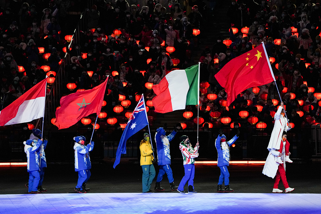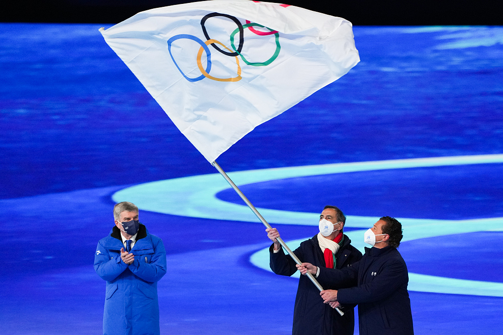 As part of the tradition, the Olympic flag was lowered down in the middle of the closing ceremony, and then passed by Chen Jining, mayor of Beijing, to Bach who passed the flag to Chen's counterparts in the Italian cities of Milan and Cortina d'Ampezzo, Beppe Sala and Gianpietro Gedina, respectively, that will jointly host the next Winter Games dubbed as Milano-Cortina 2026.