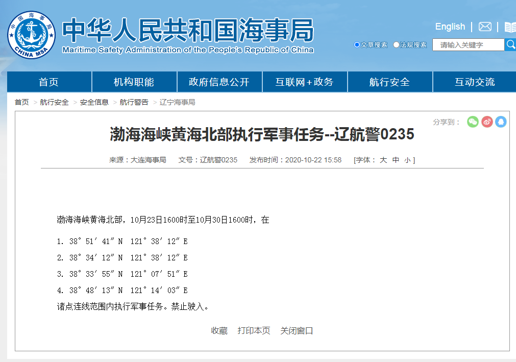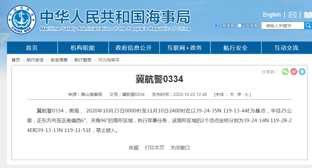 BEIJING, Oct. 23 -- According to the notice released by China’s Tangshan Maritime Safety Administration on October 22, military exercises will be conducted in waters of the Bohai Strait from October 23 to November 10, 2020.