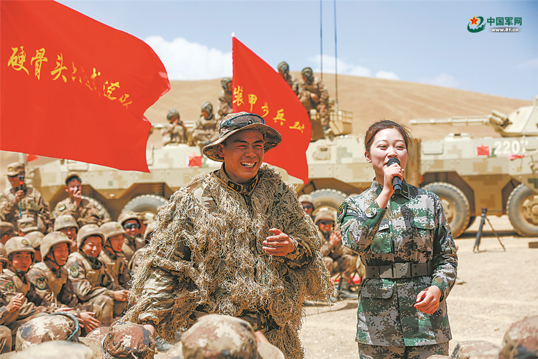 碧天如洗,山谷间阳光灿烂。官兵把战车摆成一个“八”字,把场地中间的石头捡干净,肩并肩喊着号子把地上的浮土踩实,又在场地边缘摆上一圈石子,文艺轻骑队首秀的“舞台”就搭成了。大家迫不及待地围在“舞台”前等待演出。