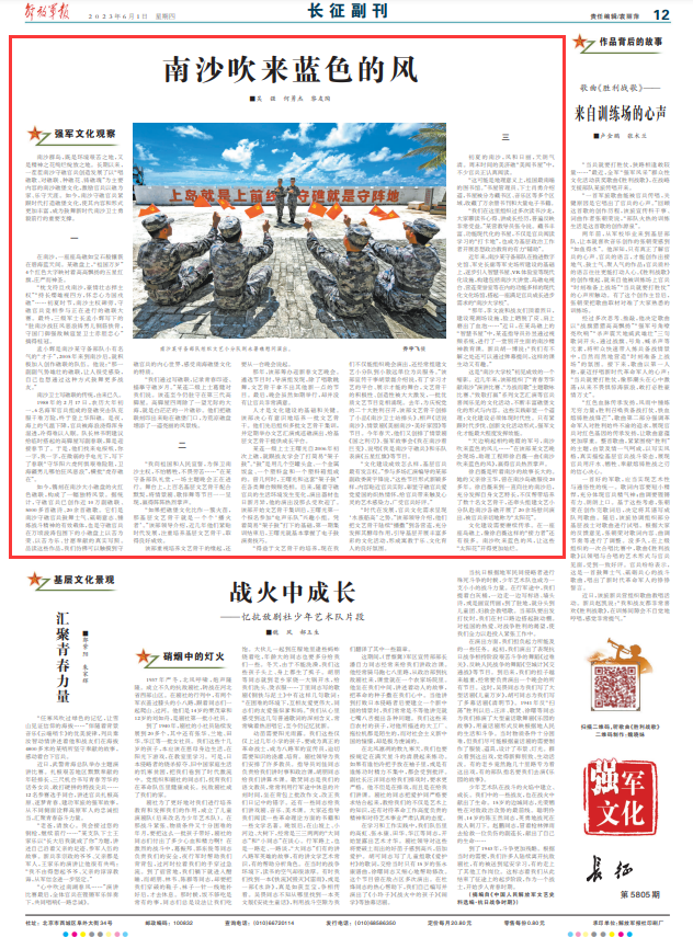 “得益于文艺骨干的培养,现在我们不仅能组织晚会演出,还经常组建文艺小分队到小散远单位为兵服务。”该部宣传干事胡景磊介绍说,有了学习才艺的平台、展示才能的舞台,文艺骨干的积极性、创造性被大大激发,一批优质文艺节目竞相涌现。去年,为庆祝党的二十大胜利召开,该部文艺骨干创排了小品《南沙卫士站排头》、相声《话说南沙》、情景剧《美丽南沙·美好家园》等节目。今年春天,他们又创排了情景剧《国之利刃》、强军故事会《我在南沙看巨变》、说唱《我是南沙守礁兵》和乐队表演《五星红旗》等节目。