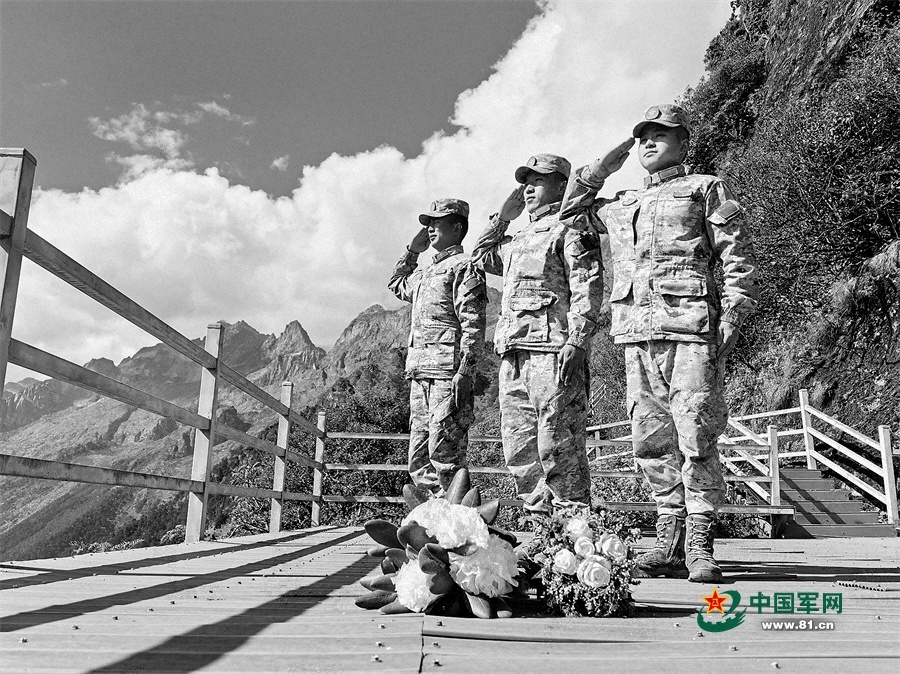 拉则拉哨所官兵在胡永飞牺牲的路段摆上鲜花,向英雄敬礼。