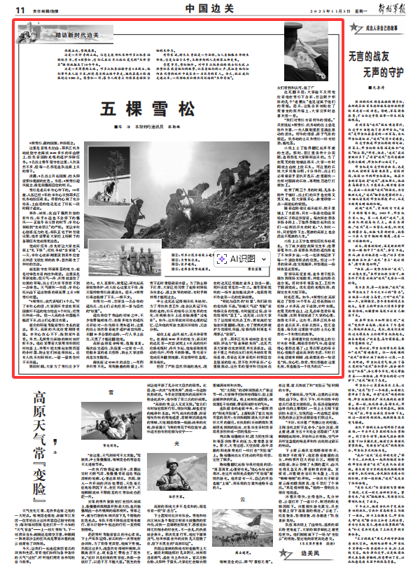 清晨,5名战士升起国旗,抬头仰望那抹亮丽的红色。身后,5棵雪松迎风挺立,像是倔强而自信的哨兵。