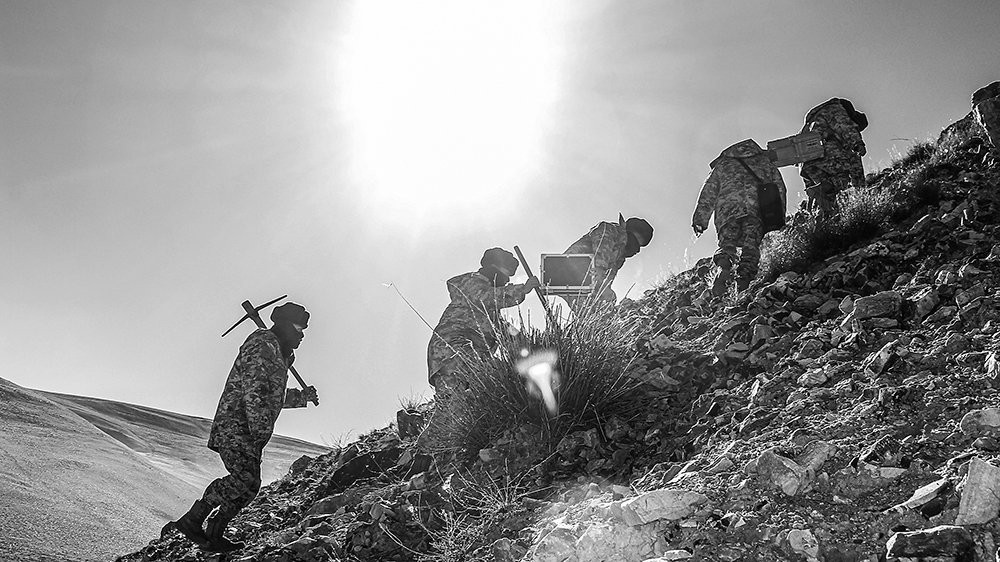 邛多江机务站战士巡线途中攀爬山坡。李文龙摄