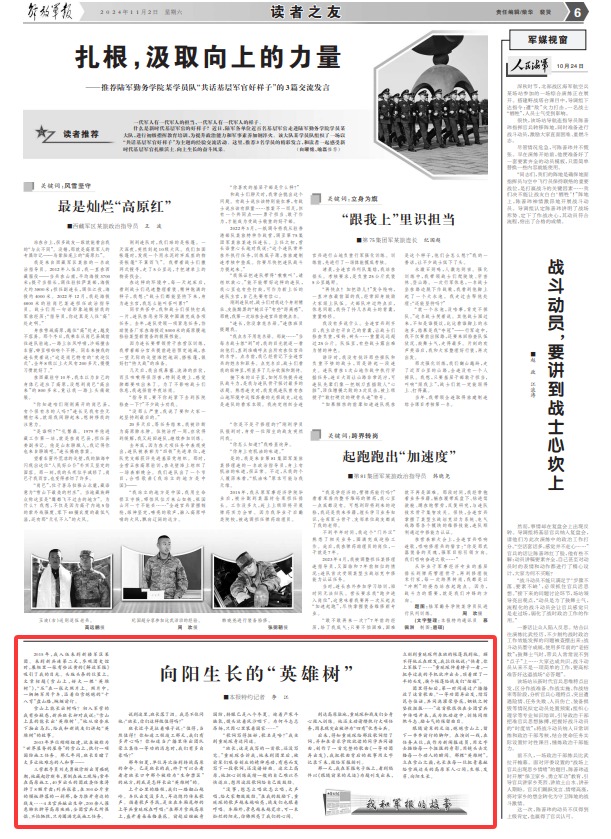那一天,我在军报电子版上,看到稿件以《跟随前辈的足迹》为题刊发出来,立刻到童延琛所在班的帐篷找到他。顾不得他正在理发,我拉住他说:“快看,你上军报了……”童延琛伸着脖子一看,一把夺过我的手机就冲出去,顶着理了一半的头发,挨个帐篷给战友们“炫耀”。