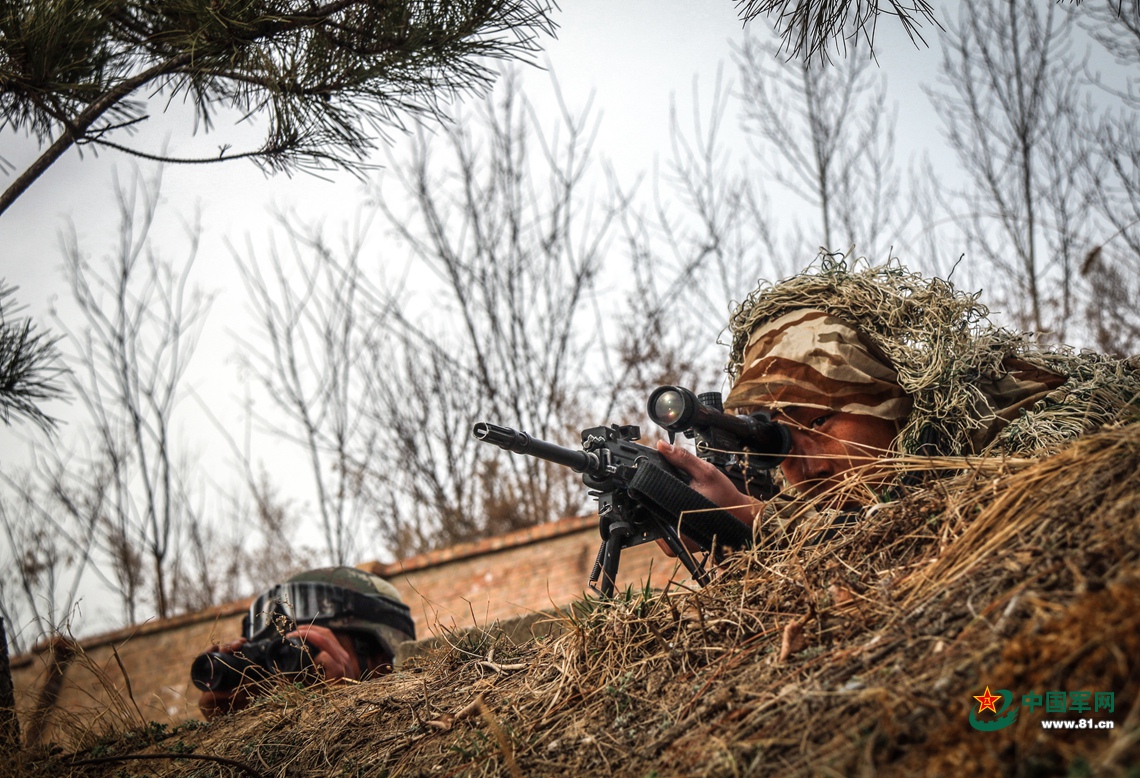 武警平凉支队官兵现地隐蔽狙击瞄准。