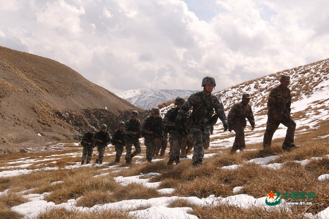 近日,驻守在祖国最西端的新疆克孜勒苏军分区迈丹边防连8名巡逻官兵与7名护边员,翻雪山、趟冰河、越山脊,对海拔3667米某山口进行巡逻。(孙家奇、刘 慎摄影报道)
