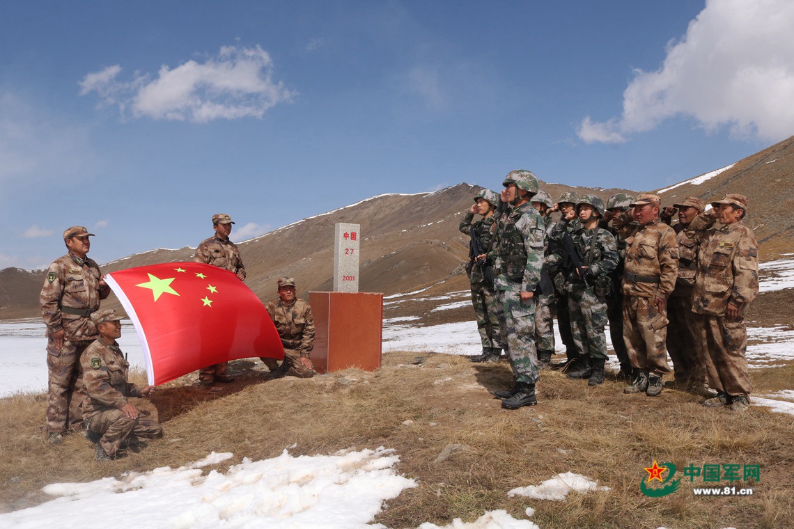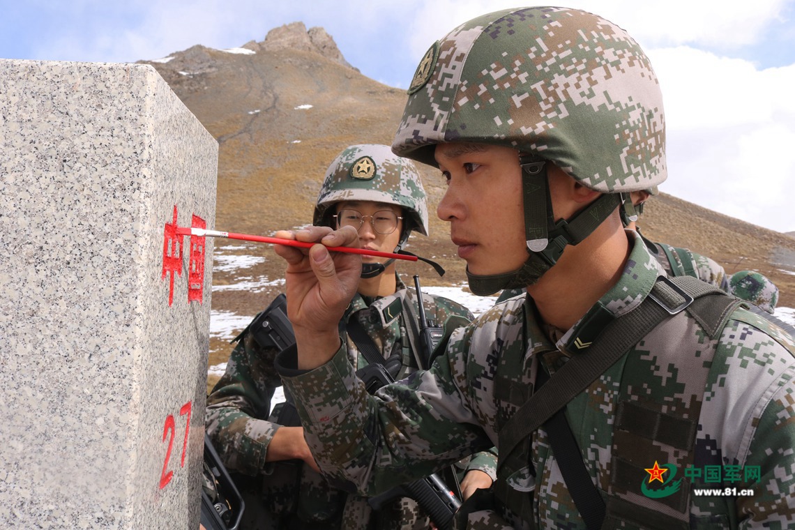 巡逻官兵为界碑描红。
