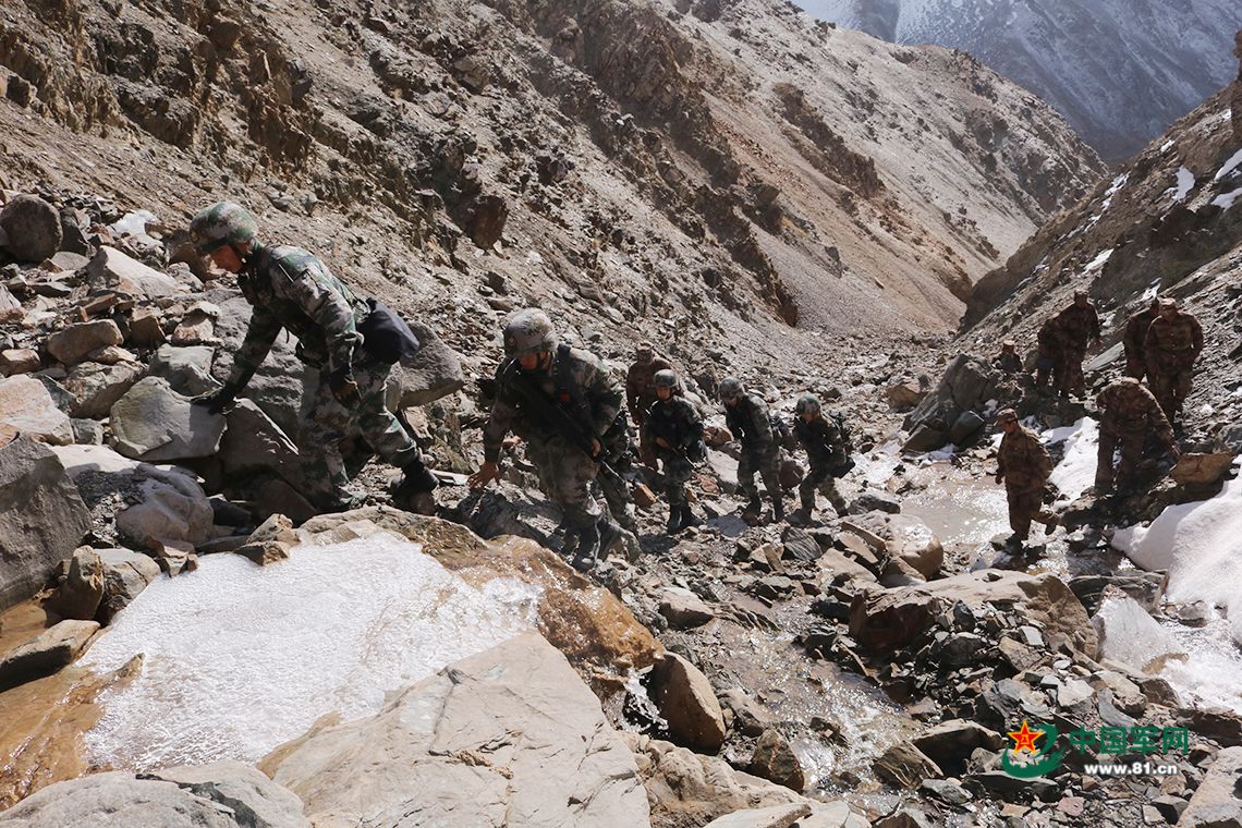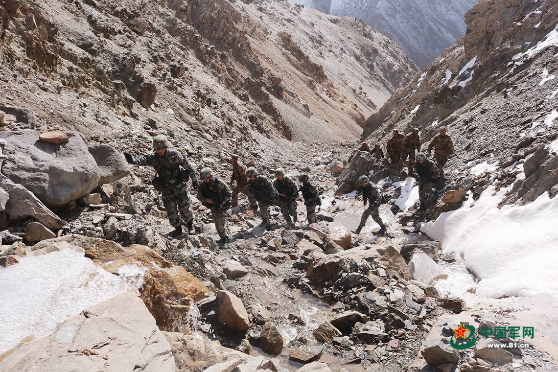 巡逻官兵在峡谷里前行。