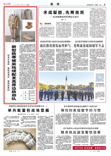 解放军报讯 记者孙兴维、通讯员胡建安报道:近日,由军委后勤保障部牵头、西部战区组织,联勤保障部队参与,军地联合为高原边防部队紧急研发并生产了一批新型防寒被装。这批物资专门为高原边防官兵量身定制,技术含量高、保暖效果好、整体材质轻,近期陆续配送到一线官兵手中。