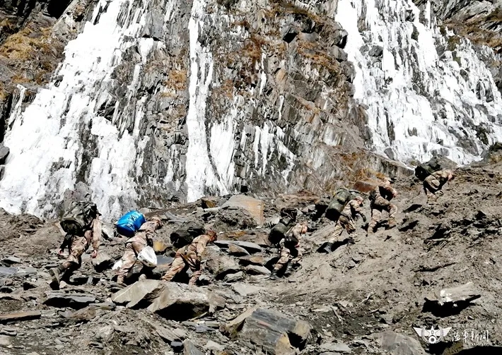 ▲官兵攀过落石崖,向驻训点运送物资
