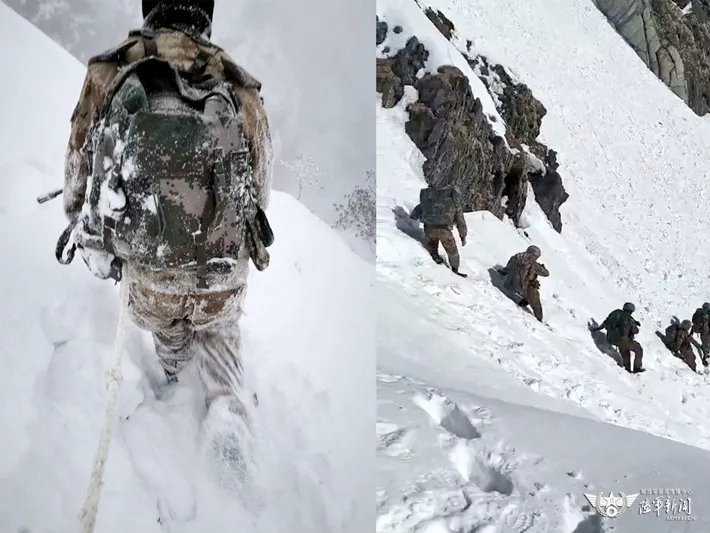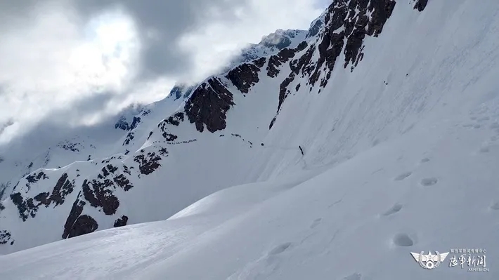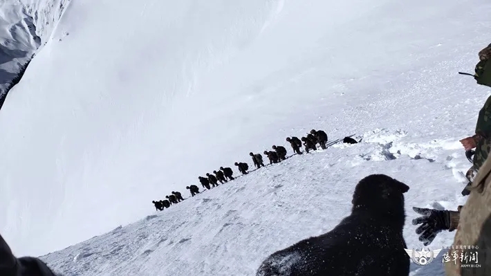 不仅道路险阻,“碎云坡”时常发生的雪崩更是危险至极。为及时发现雪崩,驻训官兵在背运物资的时候,必须要有安全员在高处观察,这是单位立下的铁规矩!