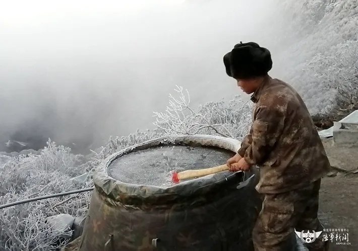 ▲炊事员做饭取水,首先要敲碎水袋上的浮冰