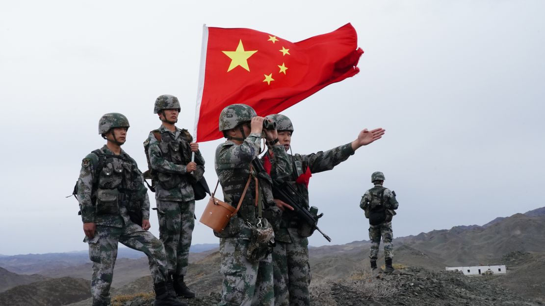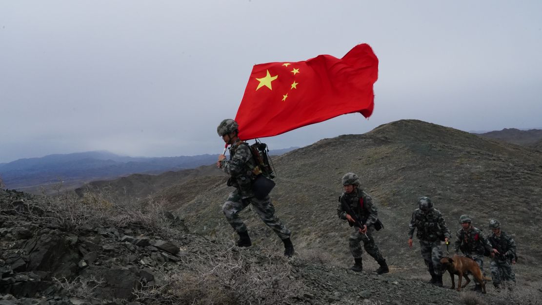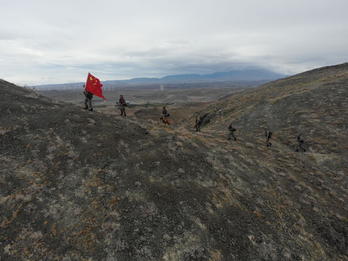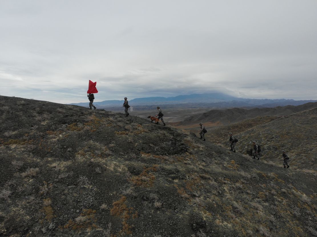 到达某高地山脚下,官兵们便下车开始徒步前进。随着海拔升高,山顶的风越来越大,天空也开始下起了淅淅沥沥的小雨,边防战士们加快了爬山的速度。终于到达了山顶,战士们高扬起手中的五星红旗,用望远镜观察着周边的防区情况。