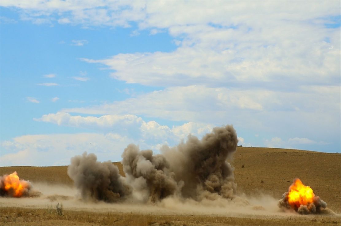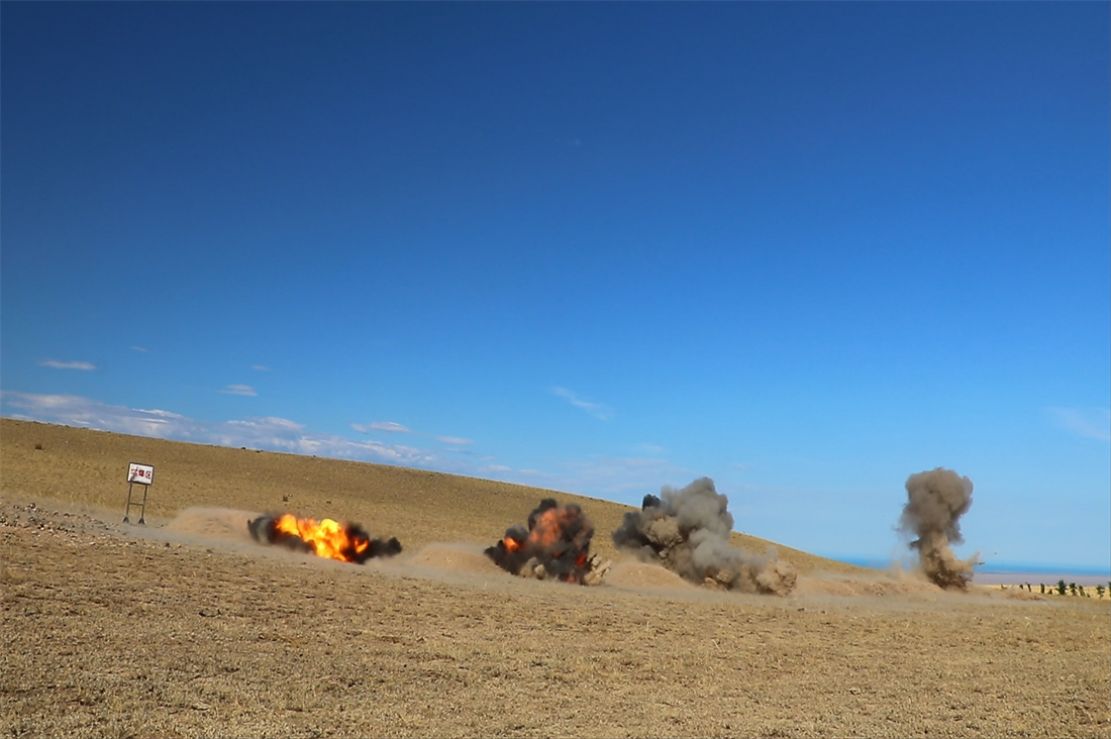 近日,驻疆某团为贴近实战练兵,将部队拉至野外地区开展实爆作业训练。随着指挥员一声令下,实爆作业现场发出连绵不断的爆炸巨响,强大的气浪伴随黑云硝烟弥漫,火球翻滚、土石飞溅、烟尘四起,一朵朵黑色云团直冲云天。