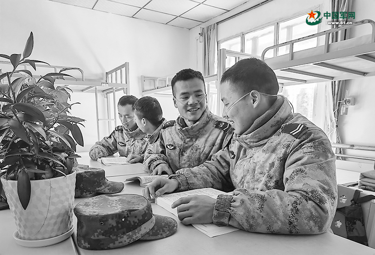 官兵在哨所绿植旁读书。
