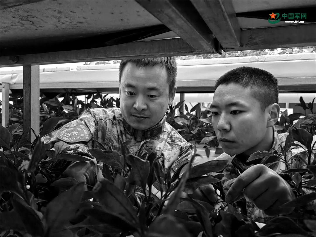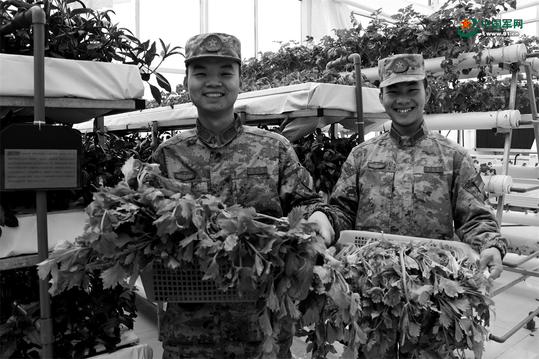 时杰(左)带着胡健在“蔬菜工厂”摘菜。图片由观通站官兵提供