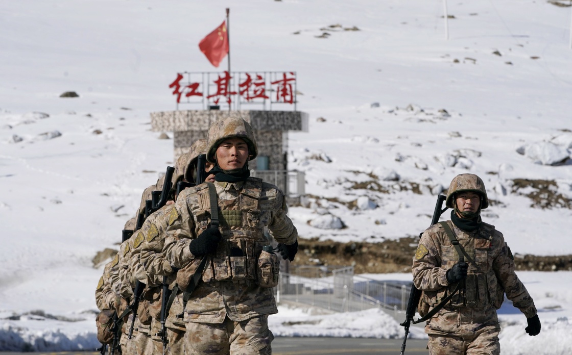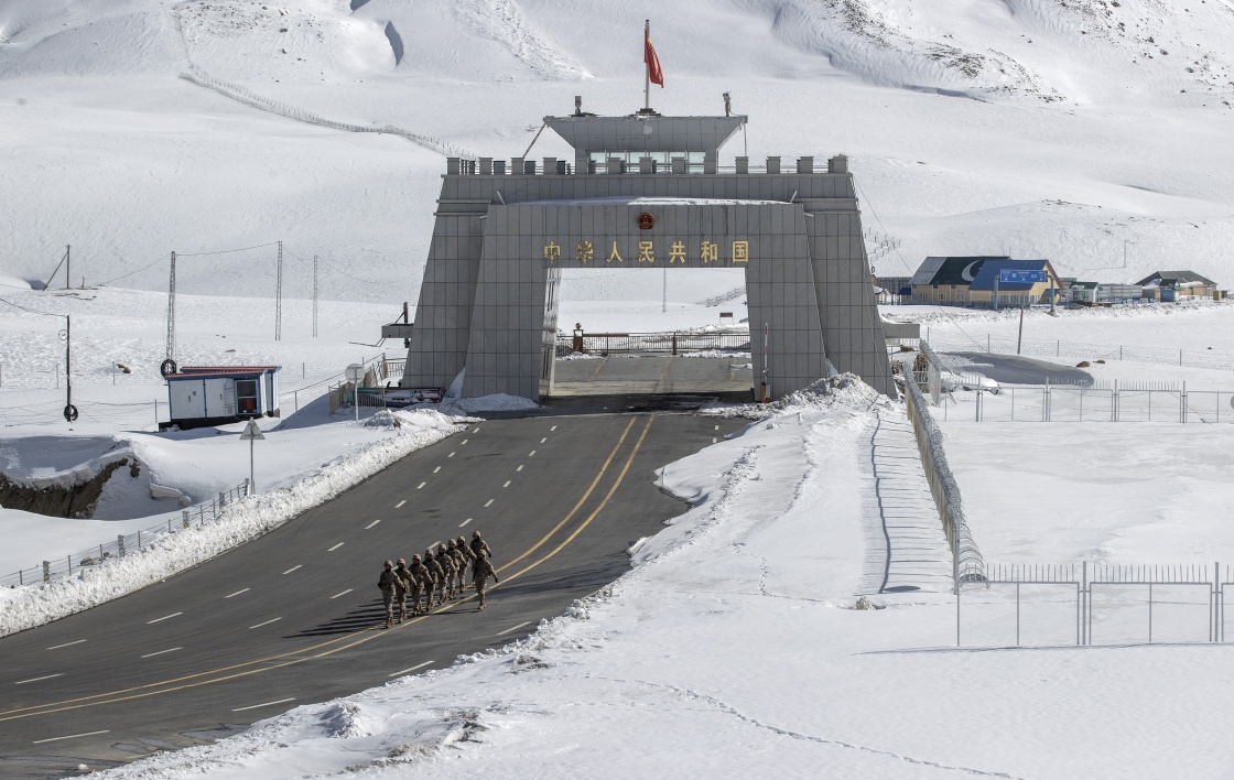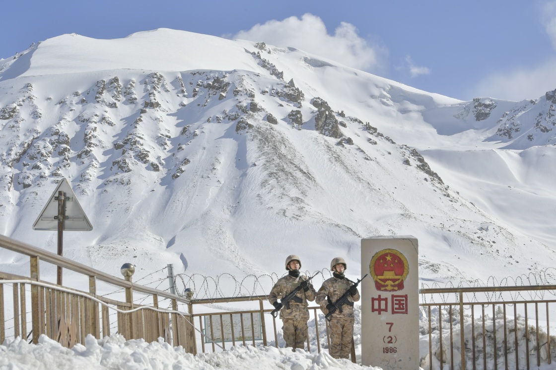 4月13日,边防连官兵在红其拉甫国门巡逻。新华社记者 费茂华 摄