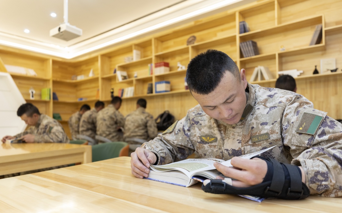 4月13日,边防连战士在图书室阅读。新华社记者 费茂华 摄