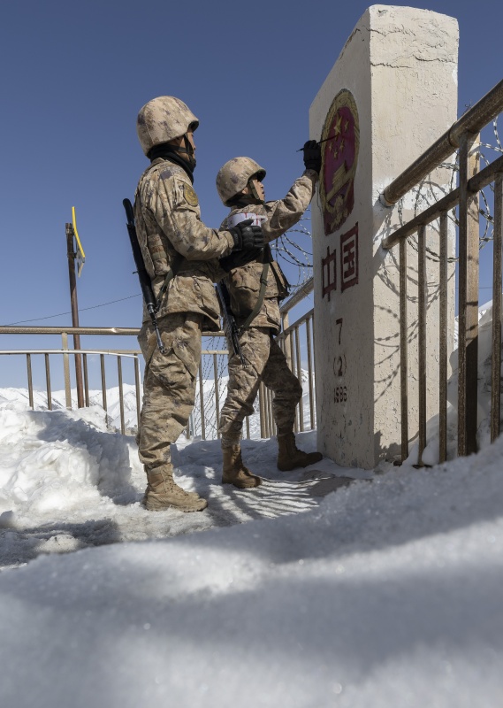 4月13日,周林平(右)和高光辉在中国和巴基斯坦边境7号界碑处执勤。新华社记者 王菲 摄