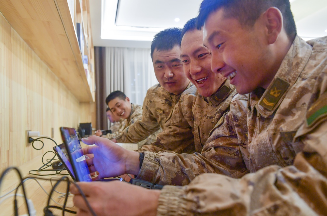 4月13日,边防连战士在图书室使用电子产品。新华社记者 王菲 摄