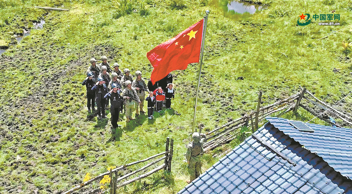 西藏军区某边防连官兵与林芝市米林市南伊珞巴民族乡民警、村民一起在“红色小牧屋”前升国旗。胡强 摄