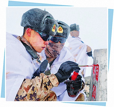 天色渐暗,山顶气温骤降,寒风呼啸。官兵们脸上没有一丝畏惧,年轻的面庞更加坚毅,互相鼓励的声音在队伍中回荡,“界碑不远了,再加把劲!”