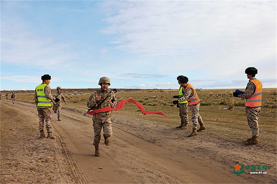 比武中,参赛官兵陆续抵达5公里武装越野终点。李朋儒 摄
