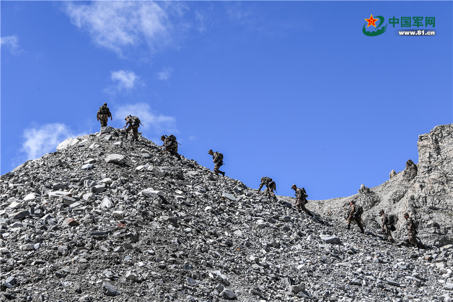 西藏军区某边防团巴弄卓康哨点官兵前往界碑巡逻,战士们手脚并用翻越乱石堆陡坡。 王巍巍 摄