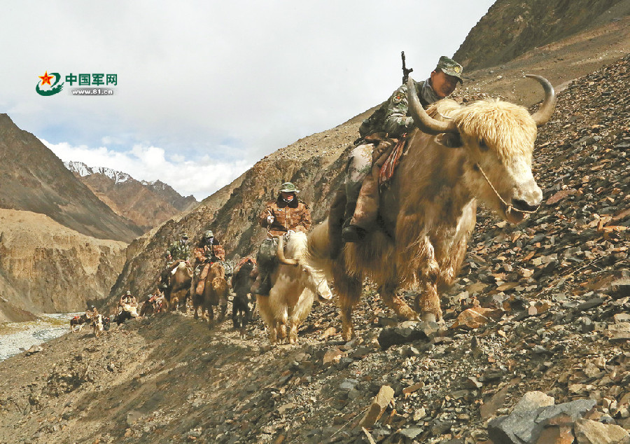 官兵骑着牦牛在碎石满地的山坡上艰难前行。张庆良 摄