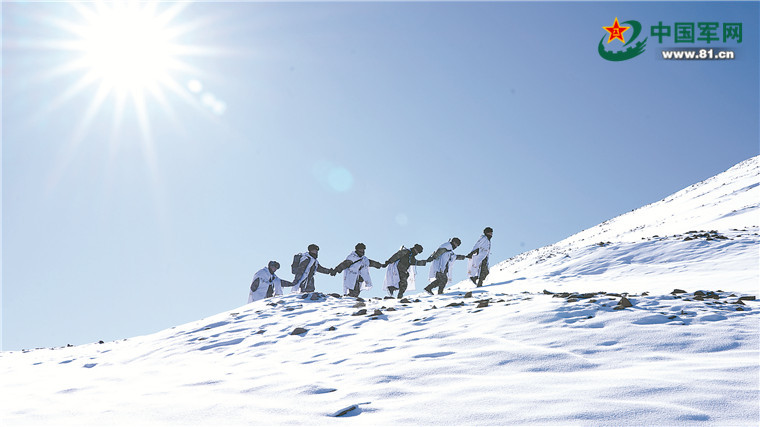 常年戍边巡逻,官兵已经练出一身攀爬冰川的本领。冰碴四溅,卢光金默念着“攀爬莫回头,铁镐要直插,身体贴紧冰,脚尖用力蹬”的口诀,十几分钟后顺利登顶。其余官兵借助绳索,一个接一个攀上冰川。