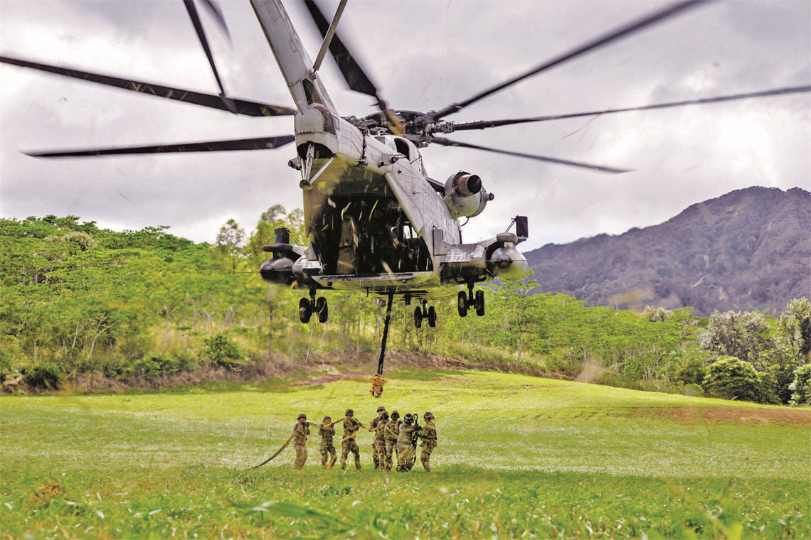 美海军陆战队重型直升机中队队员操纵CH-53E“超级种马”直升机执行吊装任务。