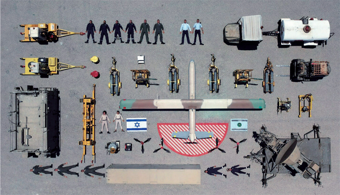 在展示中,以色列空军将一架“赫尔墨斯”450型无人机与地面操控车辆、雷达、后勤保障车辆摆放在一起,操作人员和地勤人员“见缝插针”躺在装备之间,从空中俯拍下来,整个画面如同打开玩具箱清点玩具一般,充满趣味。