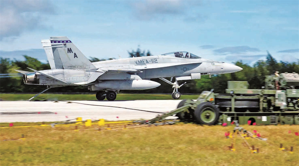 美国海军陆战队F/A-18“超级大黄蜂”战斗机在天宁岛国际机场参加演习。