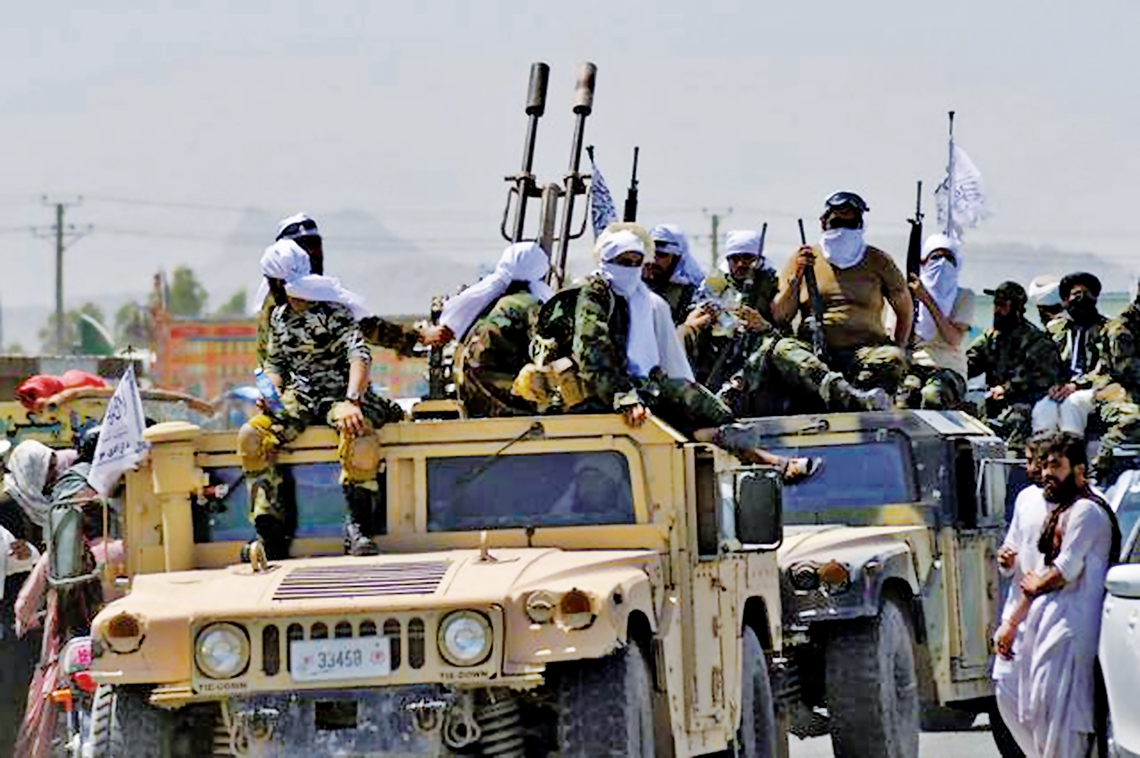 9月1日,塔利班武装人员坐在“悍马”越野车上游行庆祝