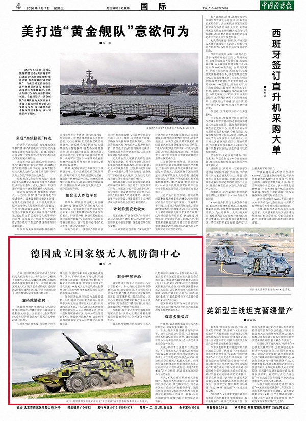 近日,德国联邦政府宣布成立国家级无人机防御中心,并将在该中心框架下组建专业部队、完善法律制度、采购武器装备及加强军地合作。有评论称,德国对无人机引发的安全威胁进行过度解读,借此组建专门机构,寻求在政治、安全、经济等领域达成多重战略目的。