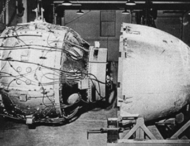 原子弹爆炸后,苏联对日宣战。数天后,日本于8月15日向盟军投降。图为原子弹“胖子”组装画面,它于1945年8月9日被空投到长崎。