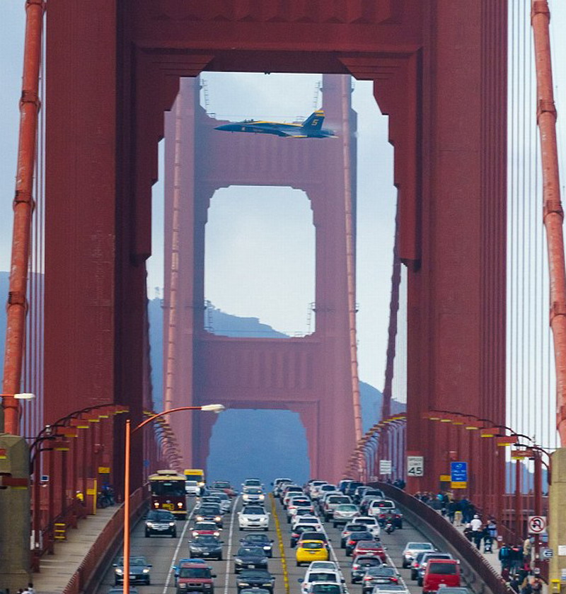 谢尔顿在一个收费广场边拍摄“蓝天使”飞行表演队。蓝黄颜色的战斗机从远处地平线飞来,像燕子般从金门大桥上空俯冲而过。谢尔顿承认:“能抓拍到这些完美的照片需要相当多的运气。”