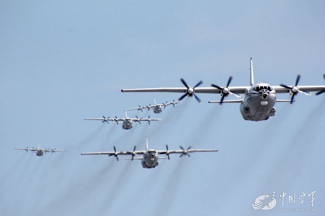 中原三月,广空运输航空兵某团大机群密集编队跟进训练。邵天红摄
