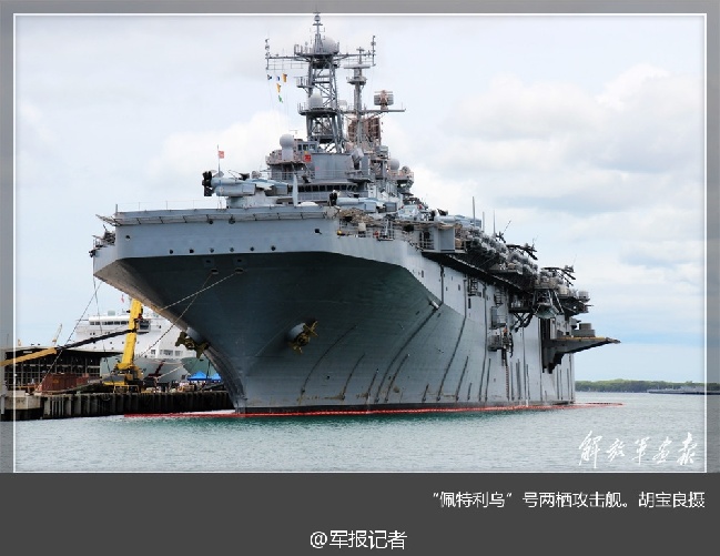 【独家:近距离实拍美国海军“佩特利乌”号两栖攻击舰】美国海军“佩特利乌”号两栖攻击舰于20世纪70年代建造,是美军第二代两栖攻击舰。该舰形如航母,舰内除直升机库外,还备有登陆艇用船坞,可实施立体登陆作战。在飞行甲板上,可看到“鱼鹰”、“海上种马”运输直升机。(胡宝良摄)
