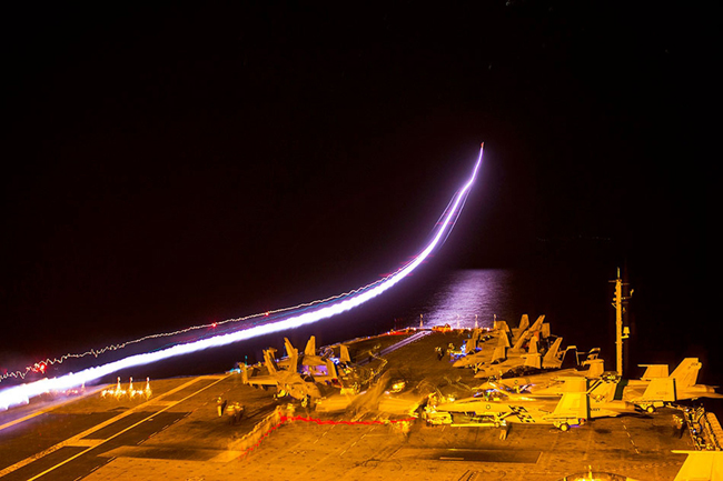 勇敢地起飞 2014年9月20日,一架EA-18G咆哮者舰载电子战飞机在勇敢之盾的军事演习期间从乔治华盛顿号航空母舰起飞。这次演习有约18000人参加。