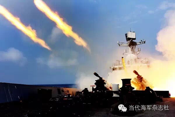 反潜攻击 初春,海军某驱逐舰支队组织驱护舰编队开展舰、潜、机协同对抗攻防演练。这是演习中,编队成功捕获水下目标,并利用深弹对“敌”潜艇实施打击。