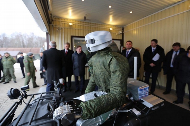 俄罗斯科研部门最新研发出一种作战机器人,作战技能几乎不逊于人类。作战机器人外形与真人相似,头戴银白色头盔,身穿军绿色上衣,腿部和双手的机械构造清晰可见。它的四肢装有传感器,可远程操控。