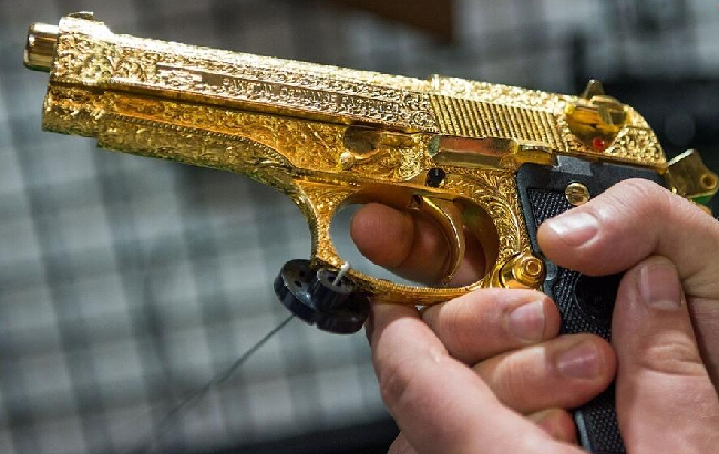 阿布扎比国际防务展上展出的黄金版意大利伯莱塔92型手枪。