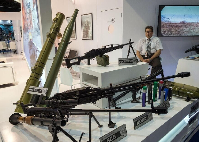 俄罗斯军工在阿布扎比国际防务展上展出的各种枪械和火箭筒。