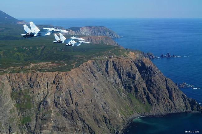 苏-30SM与图-142编队巡航海岸线