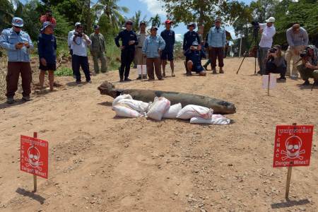 5月21日,在柬埔寨干丹省,站在MK82航空炸弹旁拍照。