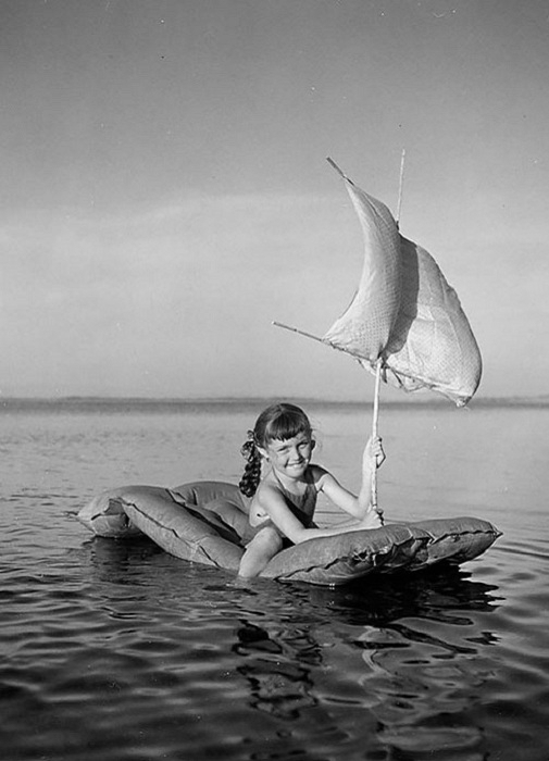 1949年,法国土伦,小女孩乘皮艇在水上嬉戏。(网页截图)