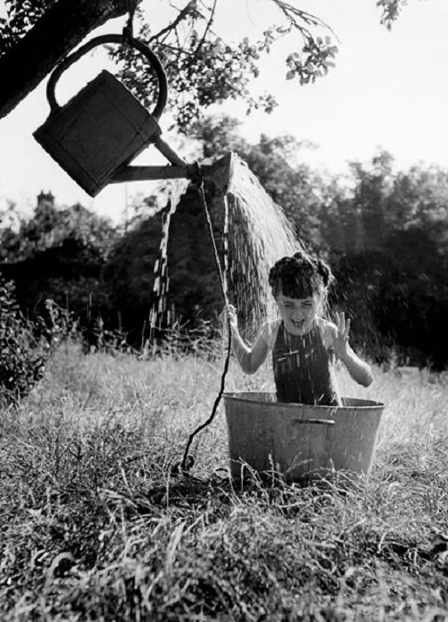 1949年,一个小女孩正在洗简易的淋浴。(网页截图)