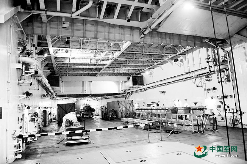 在周克傧中校指引下,笔者来到机库一块有标识的“铁皮”——升降平台上。随着几声警示,巨大的升降平台徐徐下降。“它可搭载25吨物资进行起降,大量的武器装备可以从这里藏进船坞。”周克傧中校介绍。突然,笔者眼前一亮,出现一个超大型的“洞库”,它是“坚决”号非常重要的一个部位——船坞。